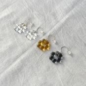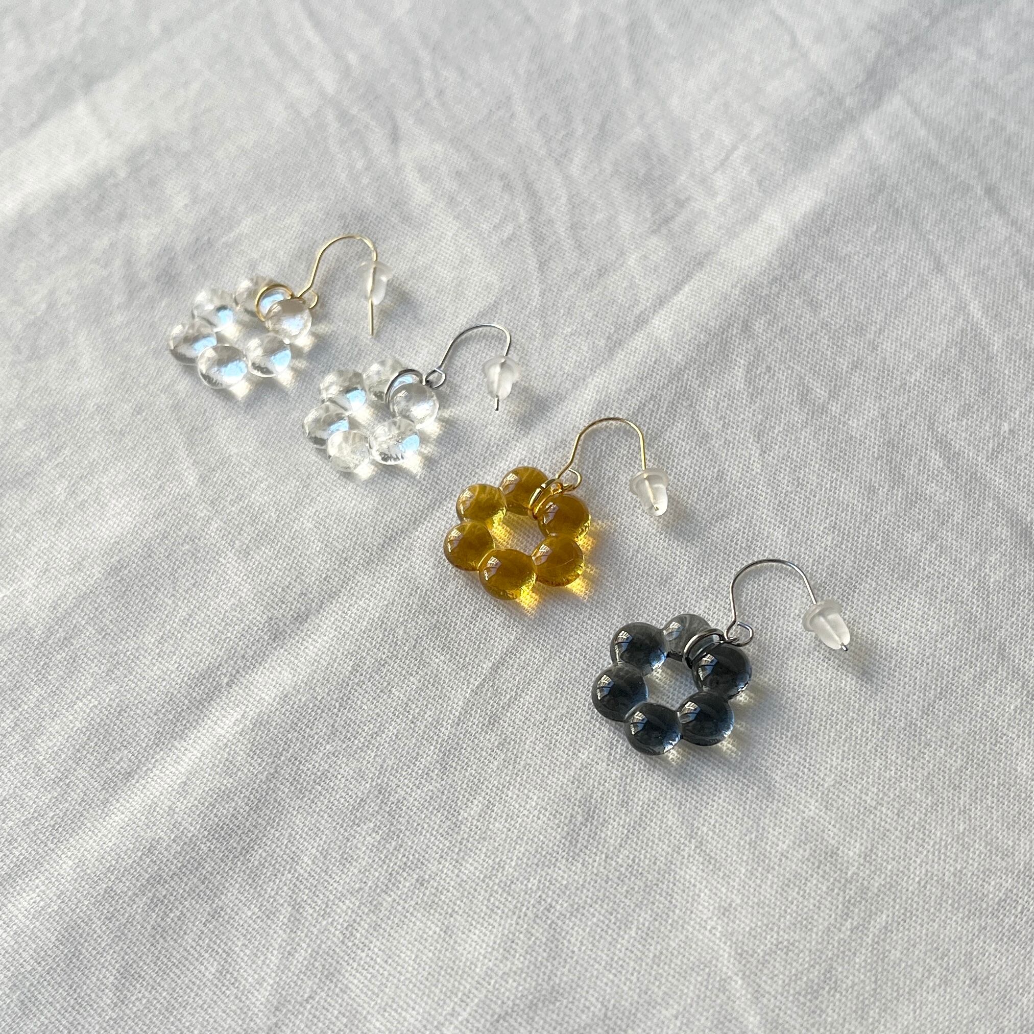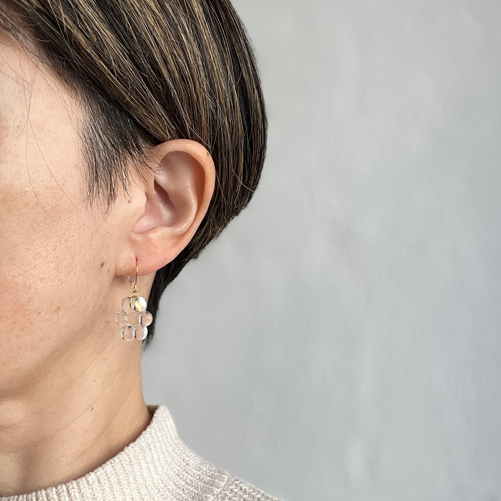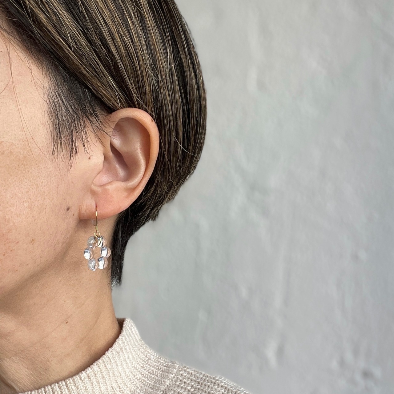 これを並べて再度窯で焼く、という工程で製作した「ガラスのポンデリング」を耳飾りに仕立てました。ペアでのお届けです。